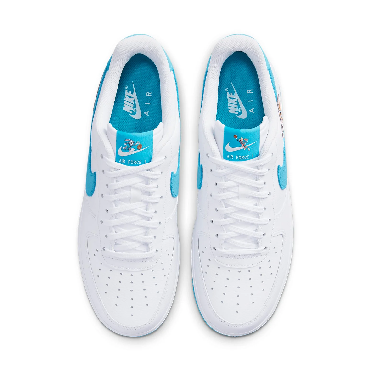 Dressed in one of the nicest shades of blue we've ever seen, this legendary Space Jam x Nithtke Air Force 1 Low 鈥淭oon Squad鈥?takes on a fun aesthetic with light blue details on the swoosh and sole. Highlighting the shoe are Bugs and Lola Bunny appearing in their Tune Squad jersey with a basketball in hand on both shoes' tongues and lateral heels.