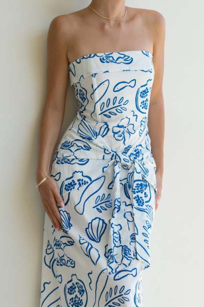 This Amalfi Coast Linen Printed Strapless Dress features a stunning blue print inspired by a soirée on the Amalfi Coast. The strapless design and waist-hugging tie detail provide a flattering and stylish silhouette.