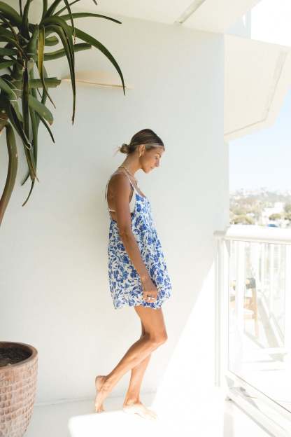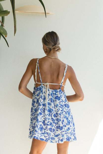 This mini sundress is perfect for your next beach getaway, with a flattering low back design and lightweight fabric that can easily be layered over a bikini or tank top. Its blue floral print adds a touch of coastal chic to your vacation wardrobe.